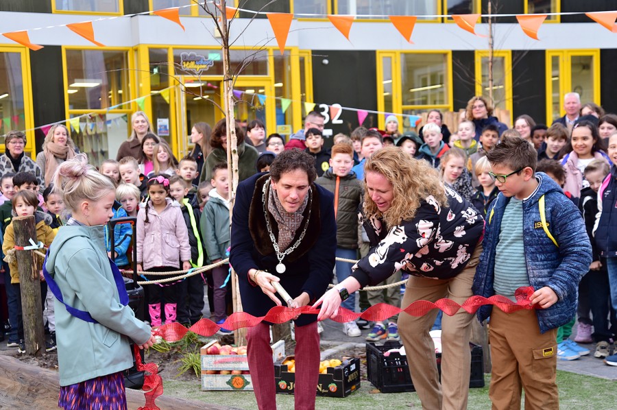 Bij de boom op het plein zongen alle leerlingen met trots ons gezamenlijke schoollied. De burgemeester vond het “heel erg mooi” en genoot zichtbaar van het enthousiasme van de kinderen. Daarna knipte hij samen met twee leerlingen officieel het lint door.